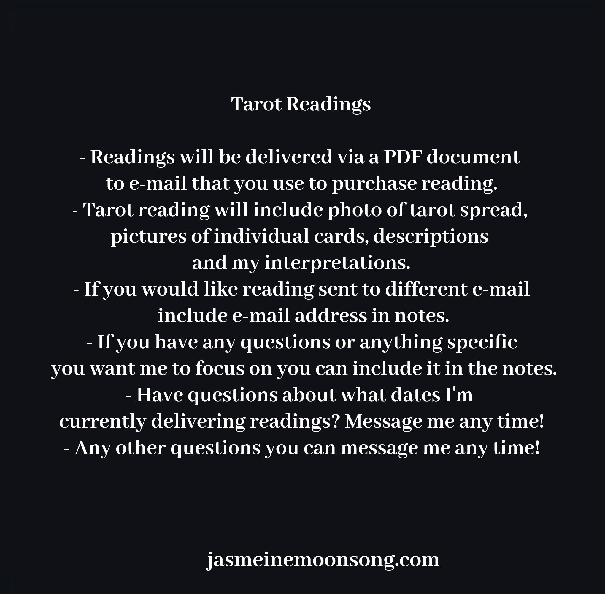 If there is anything specific you want me to look at in your reading, please make a note at payment in the message box or email me with your request at WiccanMoonsong[!at] gmail.com Thank you!